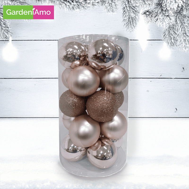 DecoNatale| Rendi le tue decorazioni più eleganti e scintillanti con il cilindro decorativo composto da 20 sfere rosa da 8 cm di diametro. Perfetto per eventi, feste o centrotavola, questo cilindro unisce stile e brillantezza grazie alla finitura metallizzata opaca con glitter.