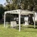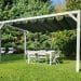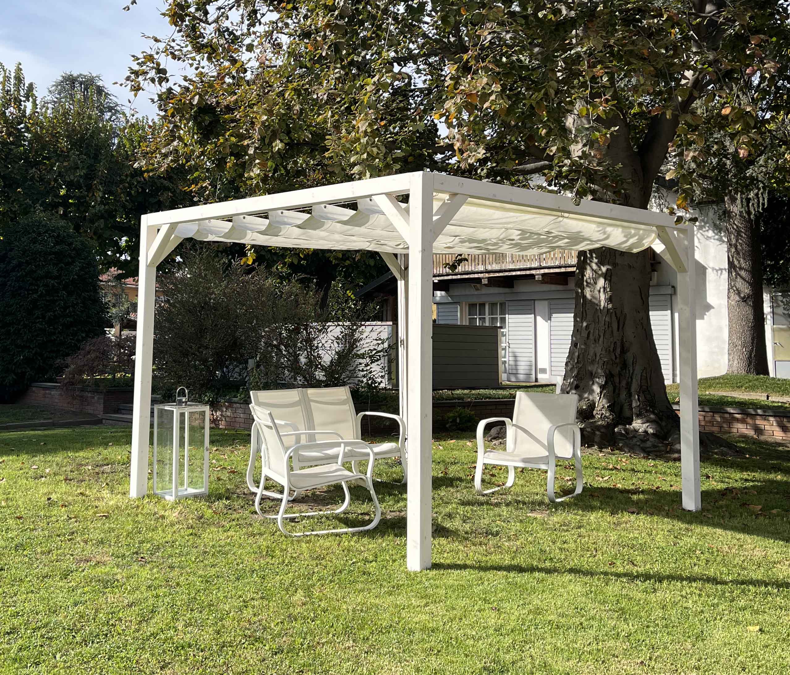 I pilastri con sezione 100×100 mm garantiscono stabilità e resistenza nel tempo, mentre la tenda superiore in tessuto HDPE da 250 gr/m², stabilizzata ai raggi UV, permeabile all’acqua e ombreggiante, offre protezione dal sole mantenendo una piacevole ventilazione naturale.