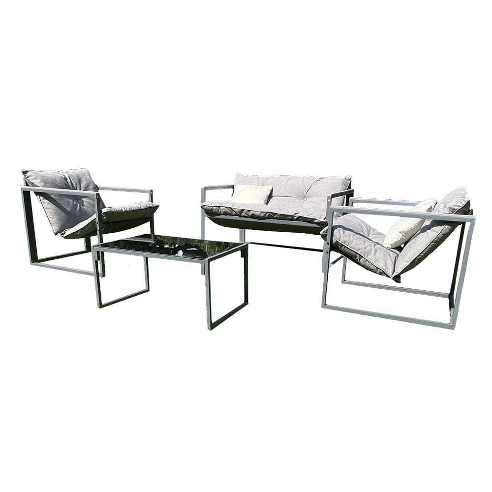Dai un tocco di stile e comfort ai tuoi spazi esterni con questo raffinato set salotto da giardino. Composto da un divano a due posti, due poltrone e un tavolino con piano in vetro, è l’ideale per creare un angolo accogliente su terrazze, balconi o in giardino.