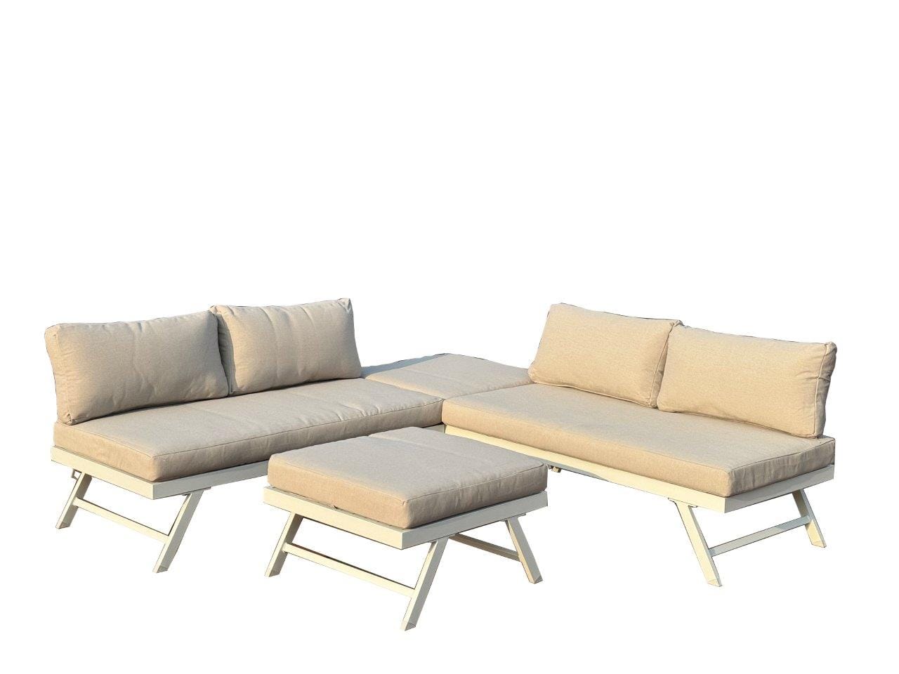 Comodità modulare e design elegante per il tuo relax all’aperto. Il Salotto Paros è un set angolare versatile composto da 2 divanetti, un pouf reclinabile e un tavolino trasformabile in ulteriore seduta grazie al cuscino incluso. La struttura in alluminio verniciato a polvere è leggera ma resistente alle intemperie, mentre i cuscini in poliestere imbottiti da 10 cm offrono un comfort superiore. Disponibile in due varianti colore: grigio ghiaia o bianco.