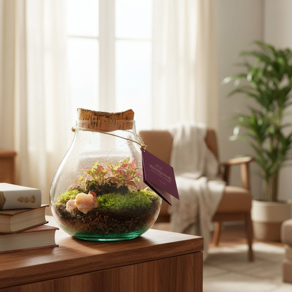 Realizzato in vetro trasparente di alta qualità, permette di ammirare la composizione interna fatta di muschi, piante ornamentali e strati naturali di substrato. Il tappo in sughero naturale contribuisce a mantenere un microclima equilibrato, ideale per una crescita sana e con manutenzione ridotta.